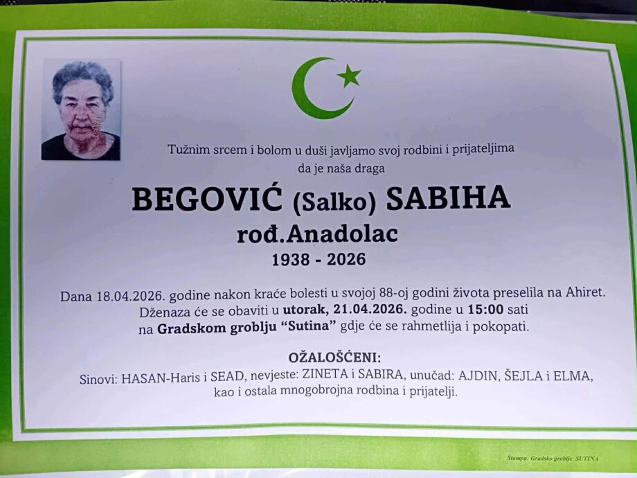 Dženaza će se klanjati na gradskom mezarju Sutina u Mostaru.